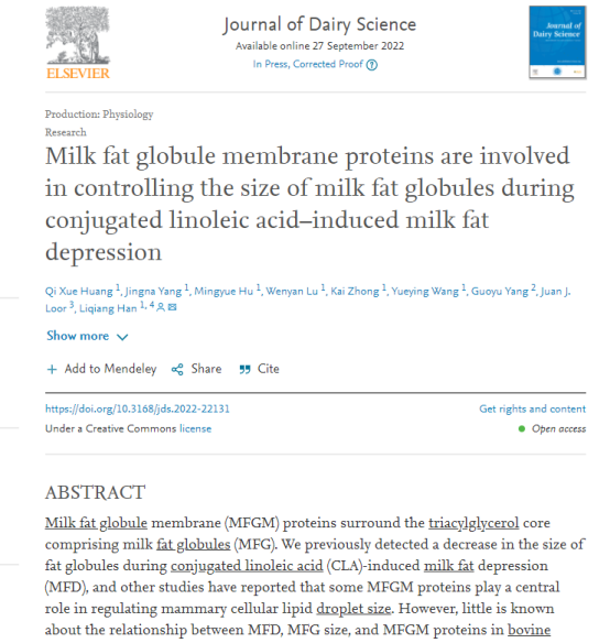 杨国宇教授领衔的兽医生物技术团队在国际知名学术期刊《Journal of Dairy Science》(中科院一区 top期刊)上全文在线发表题为“Milk fat globule membrane proteins are involved in controlling the size of milk fat globules during conjugated linoleic acid–induced milk fat depression”的研究论文。乳脂肪球粒径是奶牛重要的质量性状,影响牛乳营养特性和食品加工。论文阐明了在共轭亚油酸诱导的奶牛低脂乳症(MFD)中,乳脂肪球膜蛋白对脂肪球粒径的调控作用。