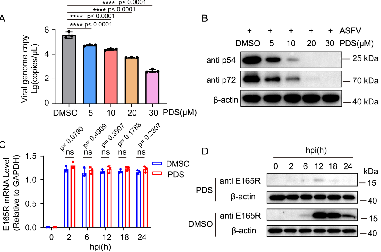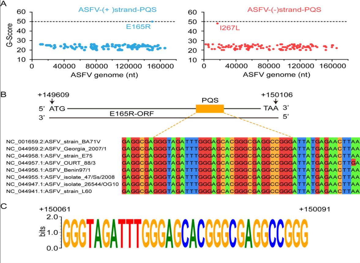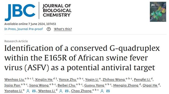 李文涛教授在国际知名学术期刊《Journal of Biological Chemistry》在线发表题为“Identification of a conserved G-quadruplex within the E165R of African swine fever virus (ASFV) as a potential antiviral target”的研究论文。该研究通过生物信息学分析发现ASFV的E165R基因上存在一段保守的富含G的序列,并证实该序列能够形成平行G4结构。进一步研究发现,G4结构稳定剂PDS和TMPyP4能够与该G4结构结合并稳定其结构,从而抑制ASFV在细胞内的复制。鉴于E165R是ASFV复制关键酶,这一发现为开发新型抗ASFV药物提供新的思路。