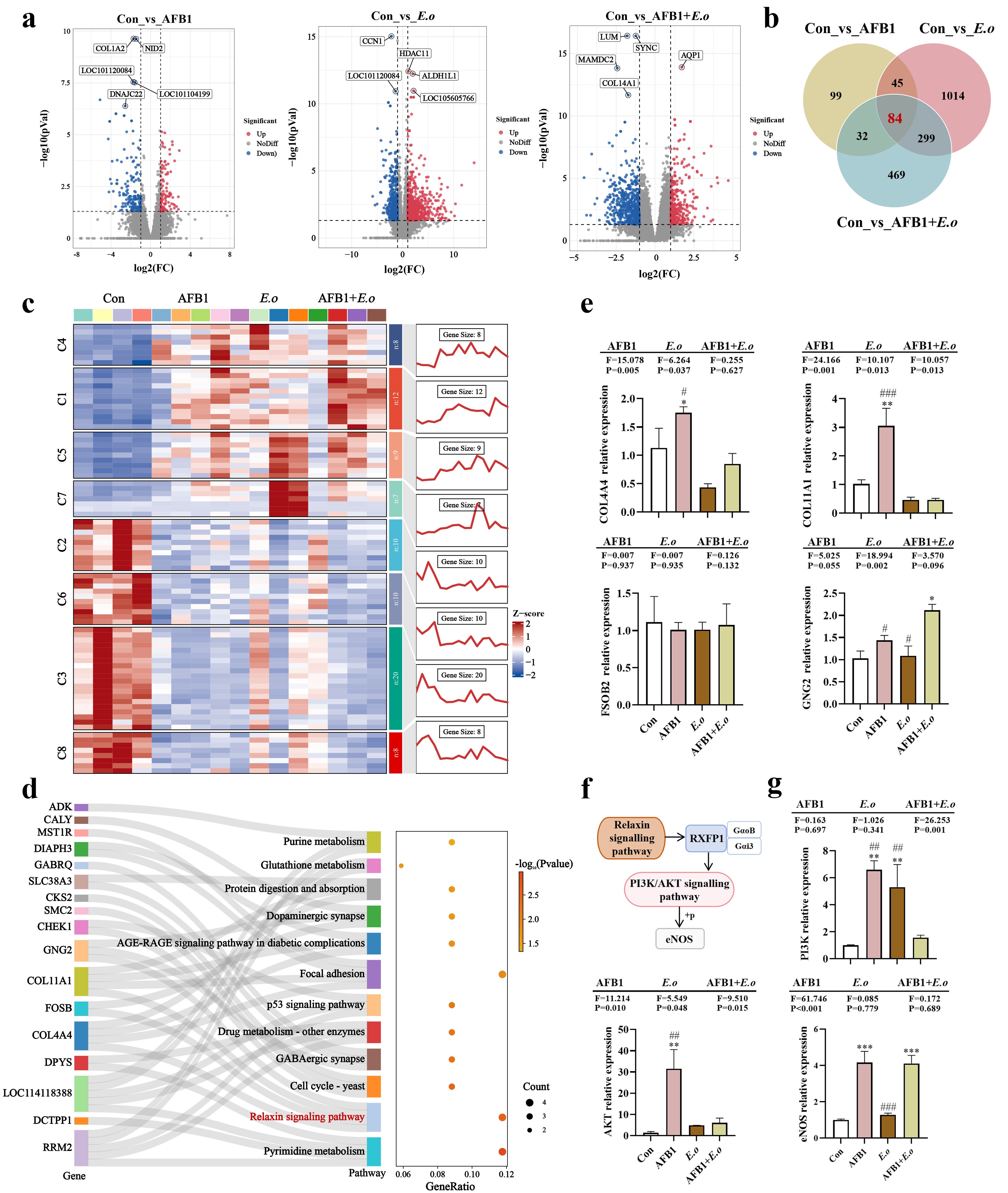 我们研究发现,AFB1和类绵羊艾美耳球虫联合也能改变绵羊子宫的组织形态学结构和血液中ERɑ和ERβ激素水平以及升高血液中炎症因子的水平,从而对绵羊的生殖系统防御产生不利影响(图2)。通过关联分析发现绵羊子宫功能的改变与肠道微生物组组成和肠道代谢物变化有关。粪便16S rRNA基因测序和粪便代谢组学分析显示AFB1和球虫联合引起粪便中拟杆菌属(Bacterioides)、副杆菌属(Parabacterioides)、棘鱼菌属(Epulopiscium)、琥珀弧菌属(Succinivibrio)、脱硫弧菌属(Desulfovibrio)、布劳特菌属(Blautia)和弯曲杆菌等革兰阴性菌丰度增加以及代谢物组成的改变。此外,同时暴露于AFB1和球虫会破坏结肠的肠道结构,导致隐窝深度降低,结肠肠道屏障蛋白Claudin 1、Claudin 4、Occludin和ZO-1表达水平显著抑制。这些结果说明肠道菌群及代谢物的变化可能损伤肠道屏障功能,引发血液LPS水平升高和激素水平变化,从而加剧绵羊全身炎症的发生。血液代谢组学分析进一步揭示,差异代谢物主要集中在氨基酸通路,尤其n -乙酰- l-苯丙氨酸丰度的改变与炎症和激素相关指标存在显著的相关性,这表明AFB1和球虫引发的肠道菌群及其代谢紊乱是机体中炎症和激素改变的主要原因,其中氨基酸代谢可能是一个主要的促成因素。接下来,我们通过子宫组织转录组学揭示其潜在的损伤机制发现差异基因主要富集在松弛素信号通路,并且通过扰乱其关键下游通路PI3K/AKT/eNOS信号通路的调控引发绵羊子宫病理损伤(图3)。综上所述,AFB1暴露和球虫感染联合通过影响绵羊肠道菌群及代谢物的变化损伤肠道屏障功能,并进一步诱发血液循环炎症和激素的变化,同时激活松弛素信号及其下游PI3K/AKT/eNOS通路诱导生殖系统的损伤。这些发现首次揭示基于肠道-血液-生殖轴AFB1和球虫联合致绵羊生殖系统损伤的一种新的作用机制,同时提示调节肠道菌群及其代谢产物可能是一种管理霉菌毒素和球虫致雌性生殖危害的有效策略。