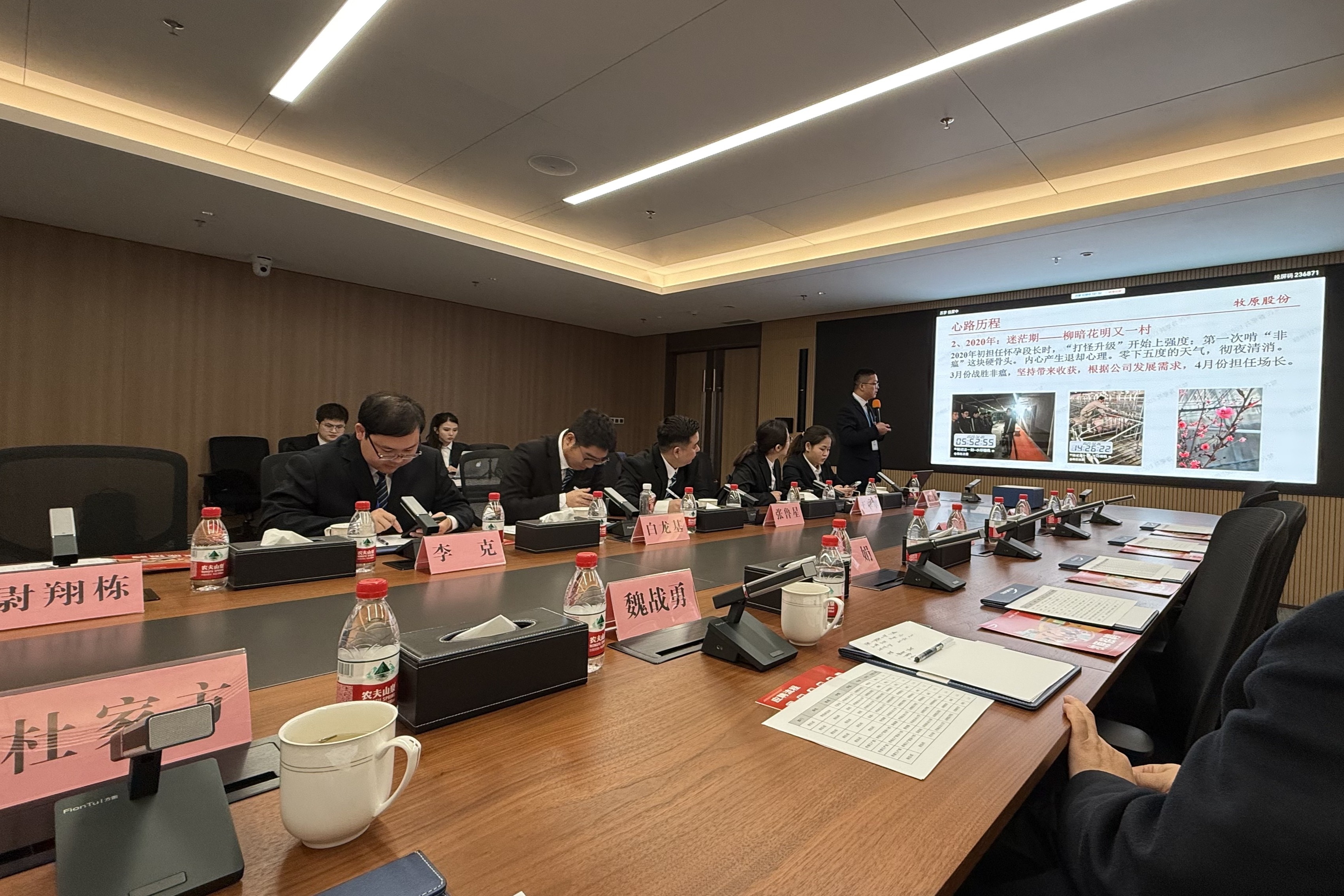 在牧原集团郑州总部,一行人参观了牧原集团展览厅,详细了解了牧原集团的公司理念、发展现状,双方在参观过程中相互沟通,谈论在生产中遇到的实际问题。