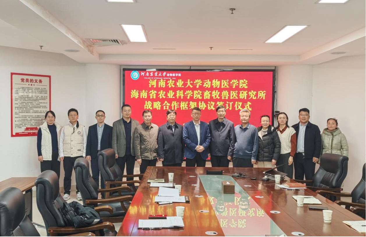 魏战勇对海南省农业科学院一行表示热烈欢迎,以“七个第一”为主题介绍了学院总体情况。他指出,禁漫 兽医学科是我国高等院校中最早成立的兽医学科之一,在兽药检测、动物疫苗与诊断试剂研发、地方种质资源保护等方面具有显著优势。近年来学院的研究生招生规模与质量持续提升,培养条件不断优化,学生科研素养日益夯实,为双方合作奠定了坚实基础。魏战勇表示,双方合作前景广阔,希望未来能充分发挥河南农大的人才和科研优势,结合海南省农科院的实验平台与硬件资源,推动科研成果共享与人才联合培养,助力畜牧业现代化发展和乡村振兴作出新贡献。