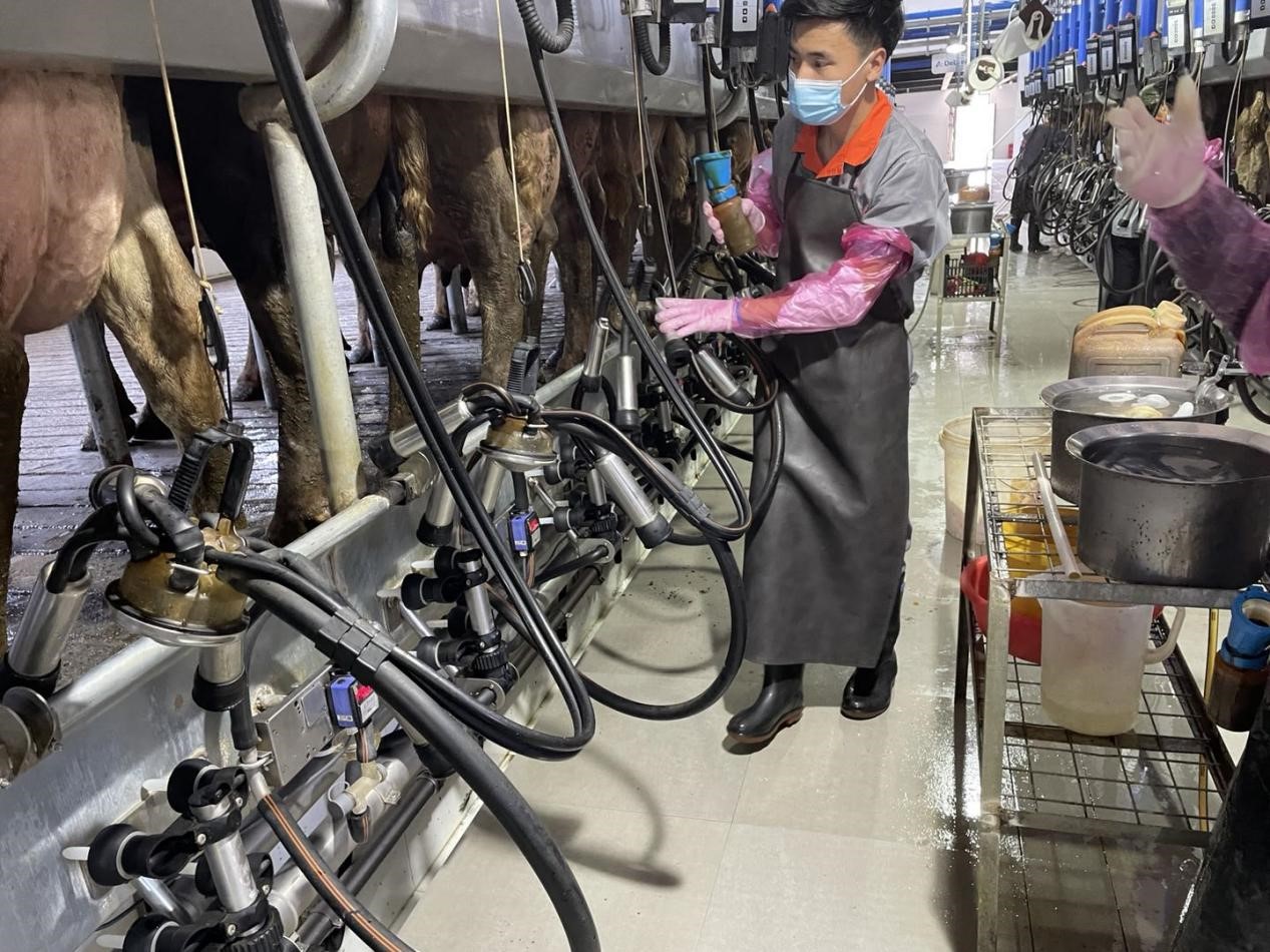 擦完之后就是挂杯,一般奶牛有四个乳头,挂杯也有四个,压着气压对应奶头就可自动吸附挤奶,个别奶牛可能奶头数量少于四个,装上假奶头就可以正常挂杯。等到奶牛的奶被挤完后挂杯会自动拉起,这个时候就要进行挤奶后消毒,方法跟挤奶前一样,不过药物浓度不同,浓度高有利于更好的保护奶牛乳头,药物中还含有可以让奶牛乳头闭合的药物,由于奶牛挤完奶后乳头是张开的,用这种药液既可以闭合奶头又可以更长期的杀菌消毒,防止奶牛患乳房炎,在所有牛都被挤完奶后,就是最后的大清洗。要对整个挤奶厅进行冲洗,清理牛粪等污物。同时打开水奶分离器冲洗挤奶器,等机器停止后要对挤奶容器进行热水刷洗,并归回原位,全部清洗完毕后今天的工作就完成了。