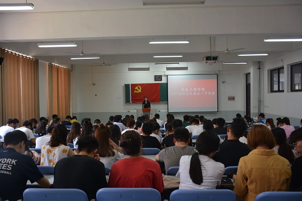 于龙子湖校区繁塔楼C208教室以《母校,我将与你齐头并进》为主题对2019届毕业生开展了最后一节党课活动,院党委副书记牛娟担任主讲,院党委组织员来卓主持,2019届毕业生党员参加会议。