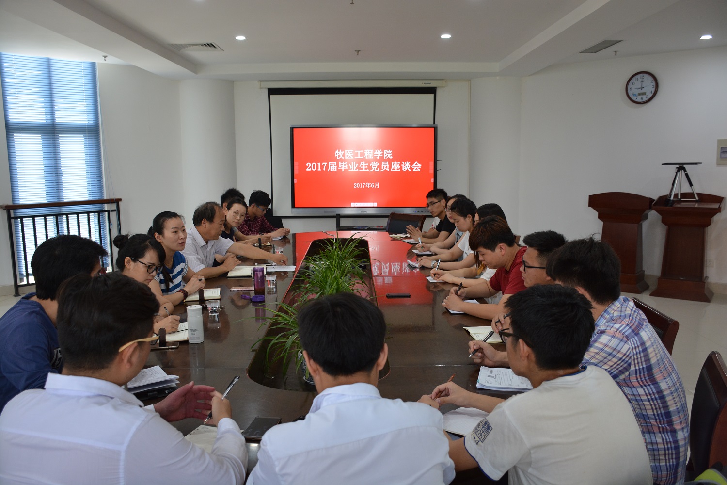 在龙子湖校区第一实验楼北430会议室举行了2017届毕业生党员代表座谈会。院党委书记臧为民、党委副书记牛娟、党委组织员来卓、团委副书记韩笑与毕业生党员代表座谈,同叙情谊,共话党建。会议由牛娟主持。