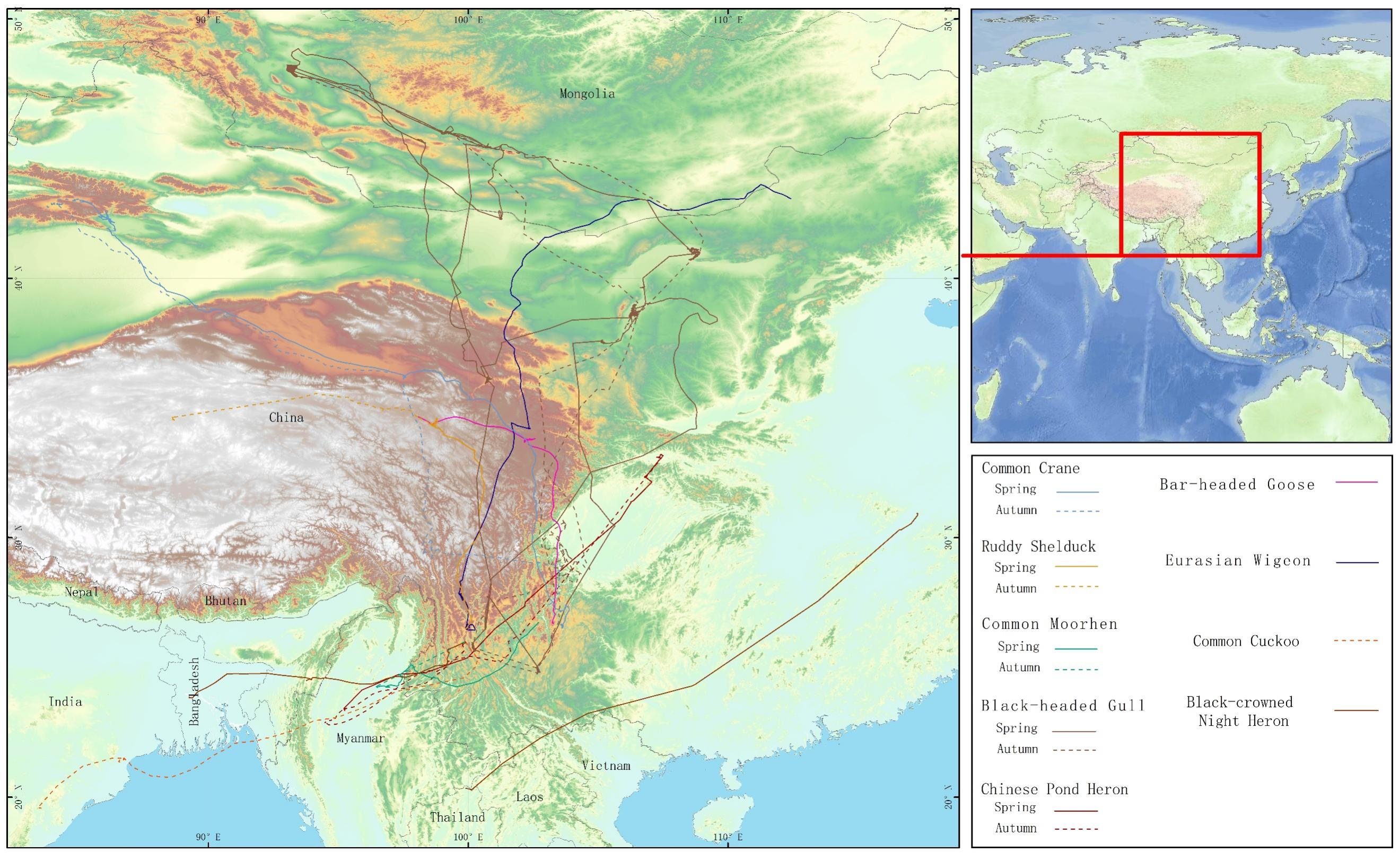 研究团队为10种鸟类佩戴了GPS追踪器,累计获取超过10万个高精度定位点。追踪数据显示,这些候鸟从云南等地,向北迁徙至俄罗斯、蒙古,或向西进入印度、孟加拉国、缅甸等地,途经中国江西、河南、黑龙江、新疆、青海、西藏、内蒙古、甘肃、宁夏等多个省份。