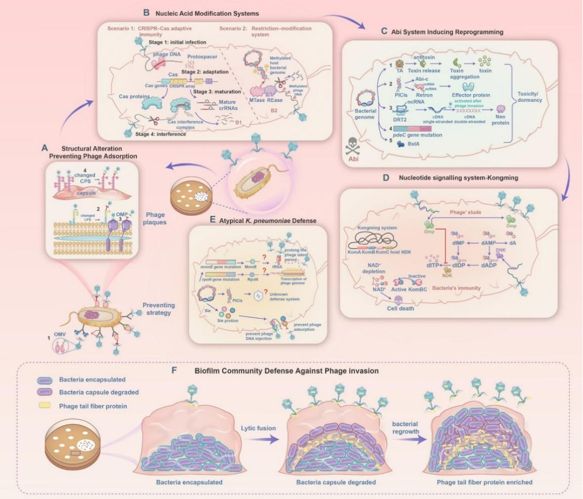 基于上述进展,该团队继续聚焦噬菌体抗KP领域,重点针对KP噬菌体抗性产生机制和抑制策略展开专题综述。文章首先梳理了KP对噬菌体抗性的时空演化特征,指出受体阻断机制在现有研究中占据主导地位(图2)。提出两种假说:进化轨迹假说与研究偏见假说。前者认为,KP与噬菌体经历长期共进化可导致净化选择,使防御机制逐渐偏向受体修饰,并削弱其他防御体系;此背景下,受体阻断优势体现了真正的进化优化。以 CRISPR-Cas 抗性系统为例,尽管其存在于约三成KP基因组中,但临床上受体介导抗性仍占首位。这可能源于受体突变在数代细菌内即可实现快速逃逸,而 CRISPR 抗性则需要经历间隔子获取与功能表达等复杂过程。此外,CRISPR 系统存在并不等同于有效防御,部分系统可能因缺少关键组分或间隔子库陈旧而处于非活跃状态。故,其表面修饰更像是“第一道快速防线”,而 CRISPR 则可能承担长期适应性免疫的角色,这一区分对于理解临床环境中抗性动态具有重要意义。
