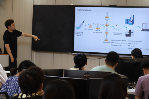 报告会上,赵金鑫深入浅出地论述了黏菌素的应用剂量对鲍曼不动杆菌耐药性产生的联系,多组学联合分析利福平对黏菌素发挥增效作用的药物靶点,计算机模拟药物体内代谢过程的建立与应用等内容。