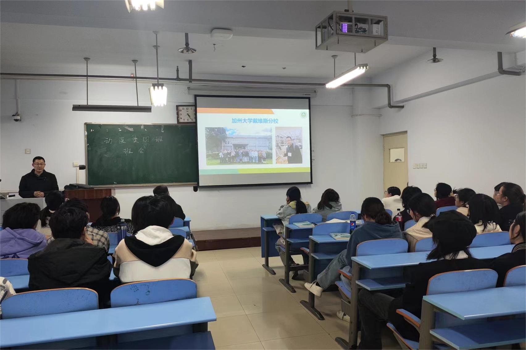 23级各班级陆续开展加州大学戴维斯分校(UCD)研学经验交流分享主题班会,各班班会邀请了范明夏、朱玉涛、康云哲、李阳、刘一和李笑然六位同学分享寒假研学经历,班会由各班班主任主持。