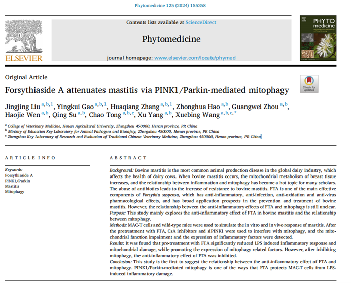 王学兵教授团队在中科院医学药学领域一区TOP期刊《PHYTOMEDICINE》(IF7.9)上发表了题为“Forsythiaside A attenuates mastitis via PINK1/Parkin-mediated mitophagy”的学术论文。该研究为寻找乳腺炎治疗靶点提供了新的线索,同时也提示连翘酯苷A可作为线粒体自噬的靶向调控药物,为奶牛乳腺炎的防治提供新思路。