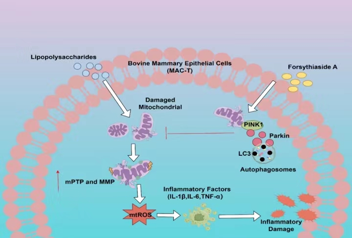 乳腺炎是奶牛养殖业最常见疾病之一,临床发病率高,造成的经济损失大,严重危害奶牛业的健康发展。我国中药资源丰富,因其毒副作用小、不易产生耐药性等优点被越来越广泛地应用在畜牧生产中。大量研究表明,中药具有抗菌、抗炎、抗氧化和免疫调节等功能,在奶牛乳房炎的防治中具有广阔应用前景。连翘是药典收载的常用中药,临床上治疗红、肿、热、痛等与急性炎症相似的症状,效果显著。连翘酯苷A是连翘的主要有效成分之一,具有抗炎、抗感染等多种药理作用。王学兵教授团队在之前研究中发现连翘酯苷A可以缓解乳腺炎症和氧化应激,调控乳腺组织中细胞的自噬和凋亡,维持细胞内环境稳定。线粒体作为细胞的能量代谢中心,为乳腺上皮细胞中乳汁的合成提供能量来源。而在乳腺发生炎症期间,奶牛乳腺的高代谢增加了其氧化和代谢负荷,这无疑给乳腺组织中线粒体的结构和功能完整发挥带来巨大挑战。连翘酯苷A缓解乳腺炎的作用机制是否与抵抗线粒体损伤、调控线粒体自噬有关,课题组围绕这个科学问题展开了进一步的研究。