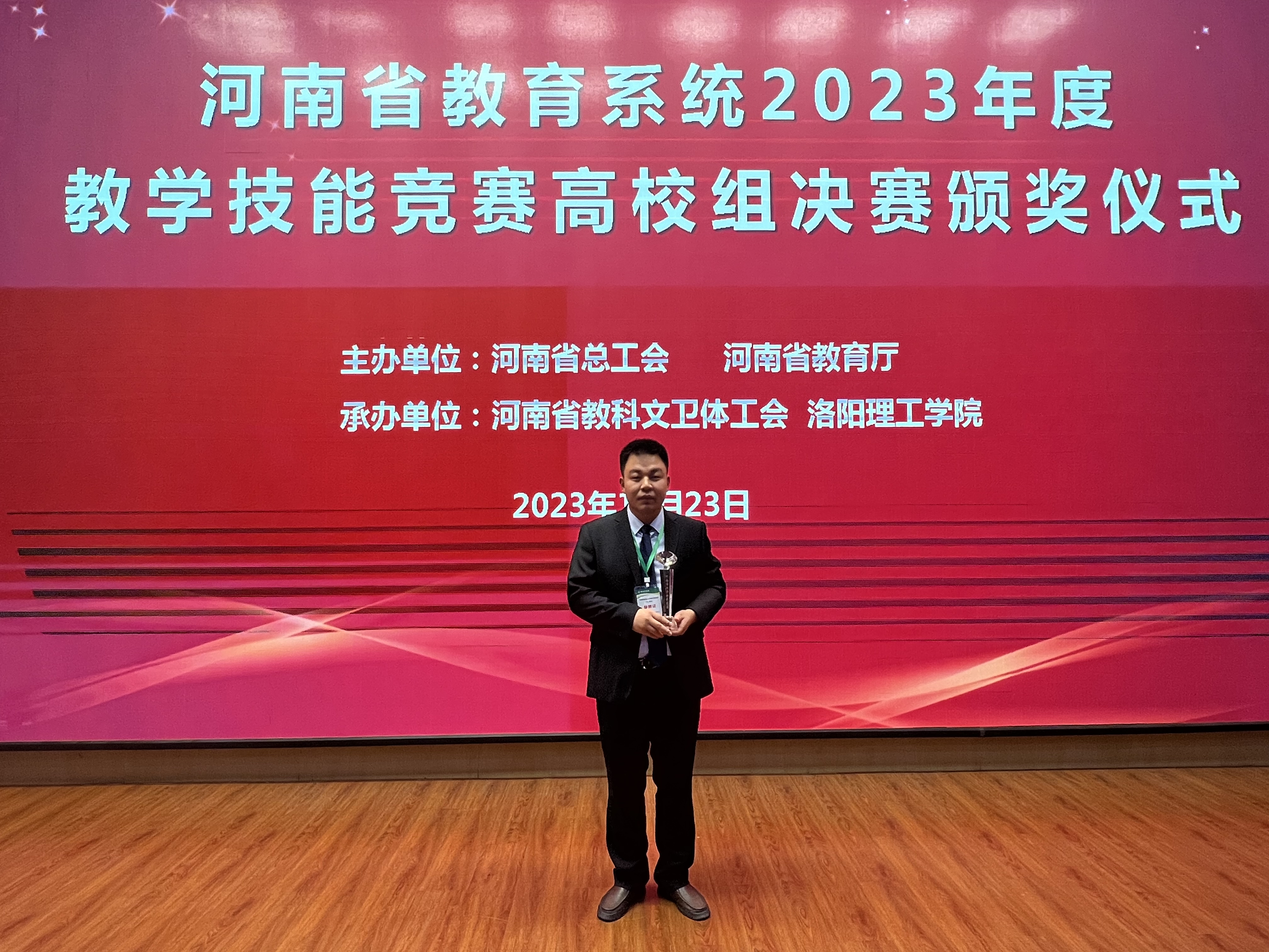 10月22日至23日,由河南省总工会、河南省教育厅主办的河南省教育系统2023年教学技能竞赛决赛在洛阳举行。经过激烈角逐,禁漫 金鑫老师位列医科组第三名,荣获一等奖的好成绩,并被河南省总工会、河南省教育厅授予“河南省优秀教学标兵”荣誉称号。