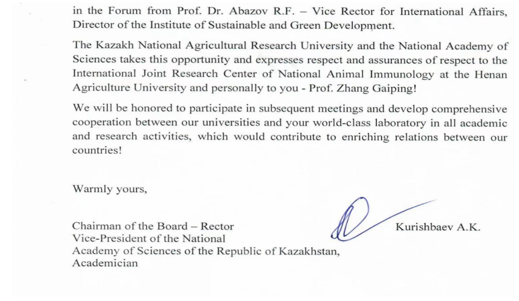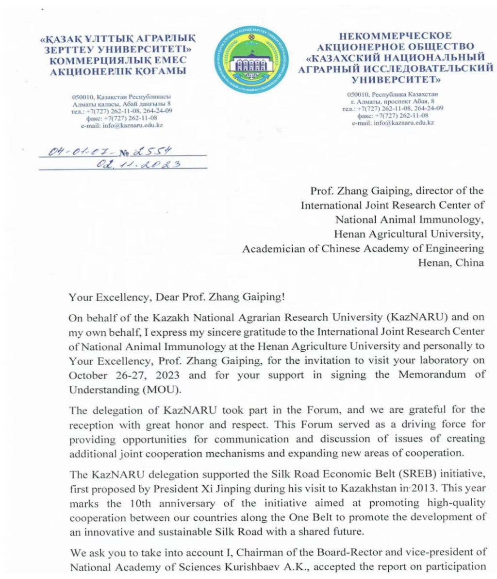27日下午阿巴佐夫·拉菲斯教授参加了‘一带一路’农业科技合作专场会议,会后访问团参观了国家动物免疫学国际联合研究中心。与会双方就实验室建设、科研合作以及研究生培养等方面进行了深入的探讨,并交换了纪念品。访问后阿巴佐夫·拉菲斯从哈萨克斯坦向张改平院士发来感谢信,信中他希望双方未来在研究生培养、团队建设及更多领域的科研合作等方面持续开展全方位合作。