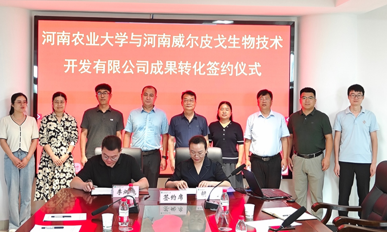 与河南威尔皮戈生物技术开发有限公司成果转化签订仪式暨本科生与研究生校外实习基地签订仪式在龙子湖校区举行。河南威尔皮戈生物技术开发有限公司董事长秦月超、总经理李炳晓、技术总监古宏杰,校社会服务处副处长王春丽,院长张龙现,动物病原与生物安全教育部重点实验室胡慧教授及团队成员参加签约仪式,仪式由张龙现主持。