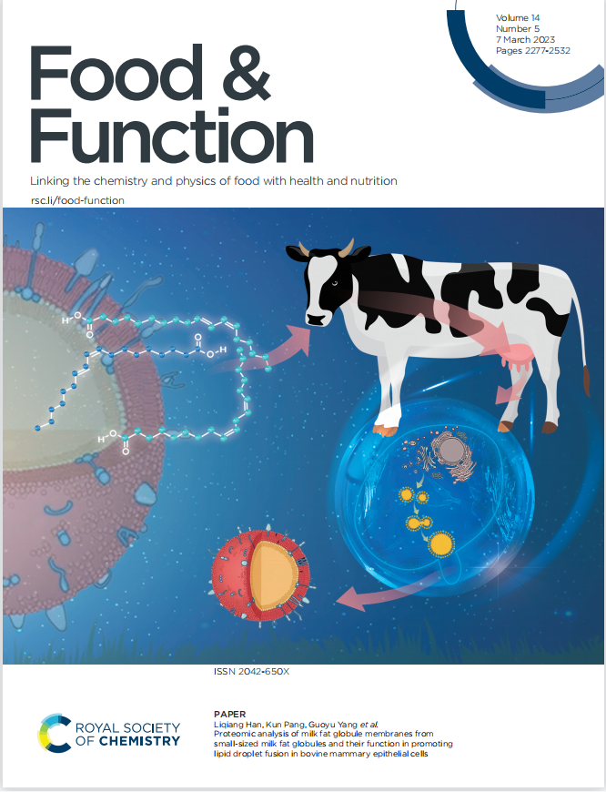 、农业部动物生化与营养重点实验室韩立强、杨国宇教授团队在解析奶牛低乳脂综合症机制方面取得重要进展。研究成果以“Proteomic analysis of milk fat globule membranes from small-sized milk fat globules and their function in promoting lipid droplet fusion in bovine mammary epithelial cells”为题发表在英国皇家化学学会旗下的国际知名学术期刊《Food & Function》(中科院一区,Top期刊)上,并被遴选为封面文章(Outside Front Cover)。韩立强教授为论文第一作者兼通讯作者,杨国宇教授为通讯作者。该研究得到了国家自然科学基金(U1904116)的资助。