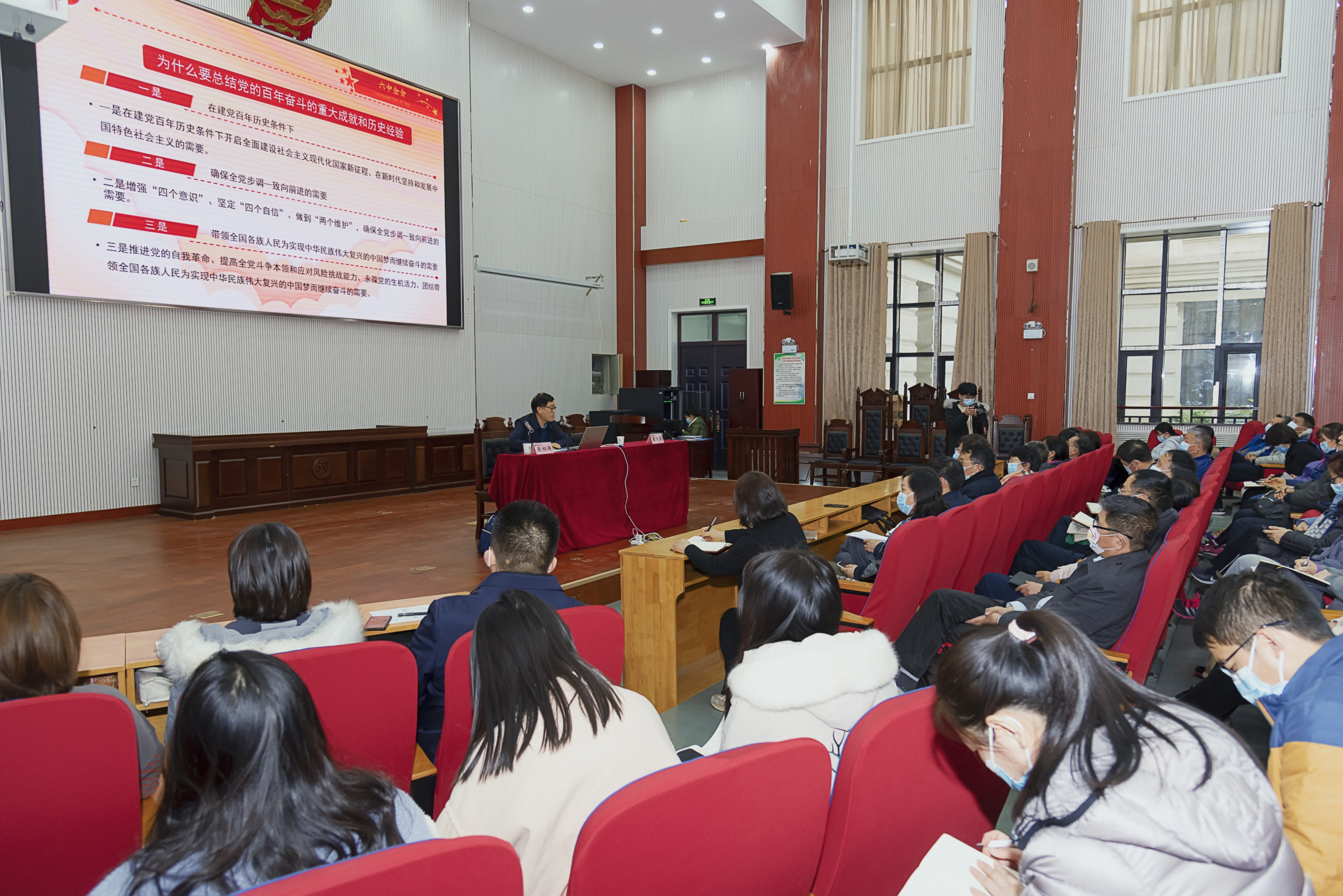 康相涛带领大家回顾了党的十九届六中全会的概况和重大意义,重点从《中共中央关于党的百年奋斗重大成就和历史经验的决议》的主要内容和重大创新、十八大以来的中国共产党带领中华民族和中国人民取得的伟大成就、中国共产党百年奋斗的历史意义和历史经验、新时代中国共产党肩负的历史使命以及我们要从党的百年奋斗历程中汲取的智慧和力量等方面深入解读了党的十九届六中全会精神。他还结合实际,叮嘱大家一定要珍惜当下来之不易的幸福生活,不忘初心再出发,勇挑重担立潮头,紧紧围绕学校建设目标,持续推动学校各项事业快速发展。