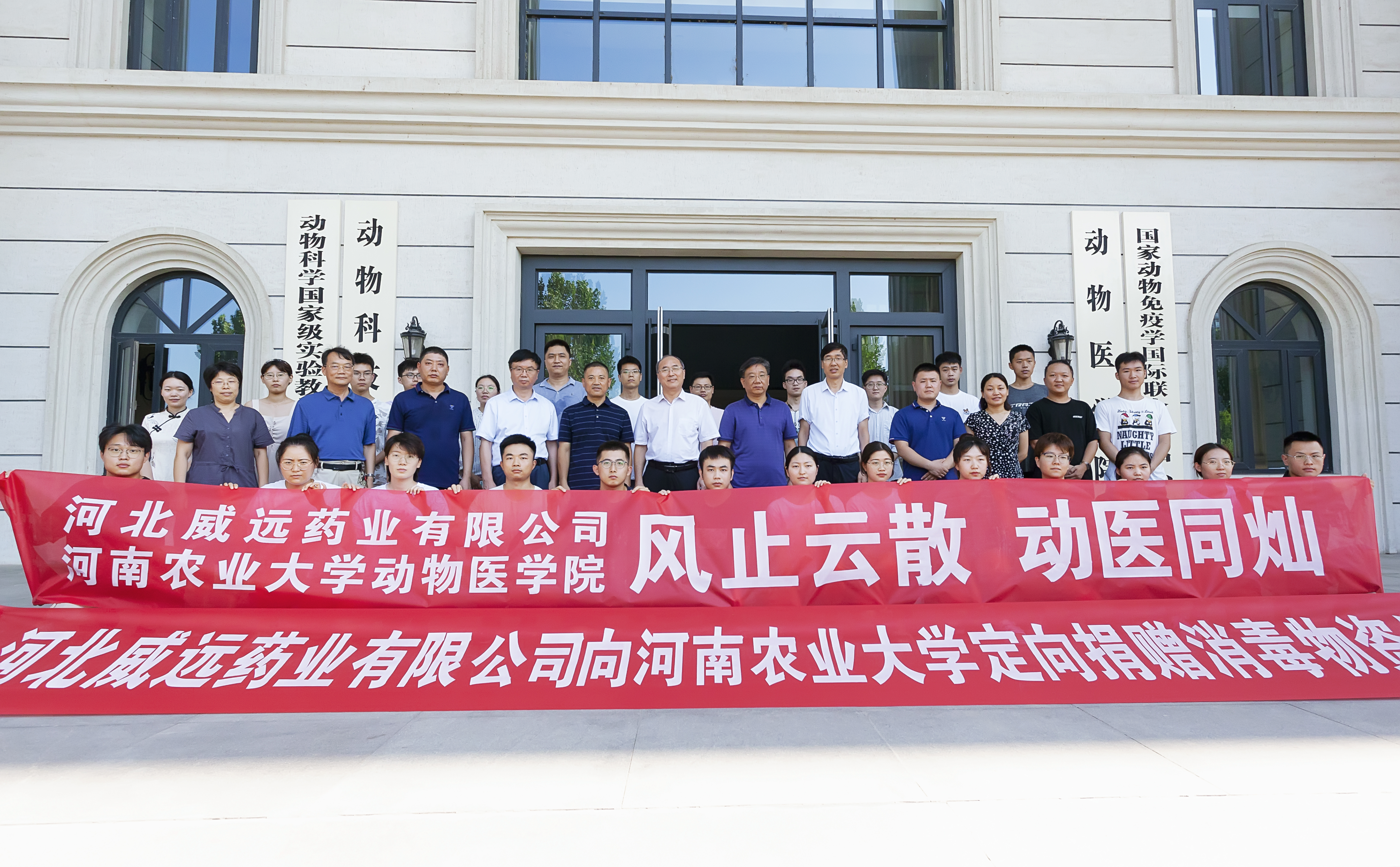 捐赠仪式结束后,学校领导、师生代表与河北威远药业有限公司负责人在第一实验楼前合影留念。