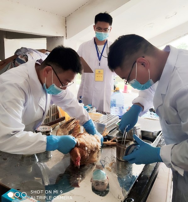 虽然在开始之前经过老师的培训,但是在真正上场的时候却眉毛胡子一把抓,完全跟不上节奏。比赛现场技能考核分为猪瘟疫苗注射、猪前腔静脉采血、鸡翅静脉采血、鸡心脏采血、鸡体解剖与采样等5项。参赛选手是在第六届河南省畜牧兽医技能竞赛中经过层层选拔获得优异成绩的六位精英,他们拥有着娴熟的专业技能,例如鸡翅静脉采血全程只需要20秒左右即可完成。而我的任务就是观察他的步骤是否有误,采集的血液是否达到标准,同时还需要根据教练的口令进行相应的计时,可谓脑眼手并用,时刻保持着高度集中的状态,不敢松懈一刻。经过几轮的观察,我逐渐掌握了每项的要领,比如秒表计时后就观看他的步骤、采血的时候观察他几次进针、鸡体解剖实验要看他是否每次都进行消毒、猪瘟疫苗注射的时候要观察他是否有回针的动作等,在多次的观摩之下,我的裁判技能也更加成熟了。