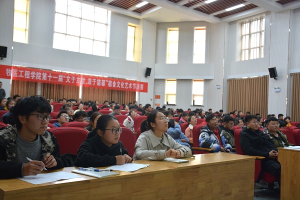 于大教室7举办第十一届“文于友爱 源于德馨”宿舍文化艺术节决赛,14个宿舍代表现场展示,院团委副书记韩笑、学生干部代表及各兄弟学院生保部部长担任评委,全体2019级学生参与活动。