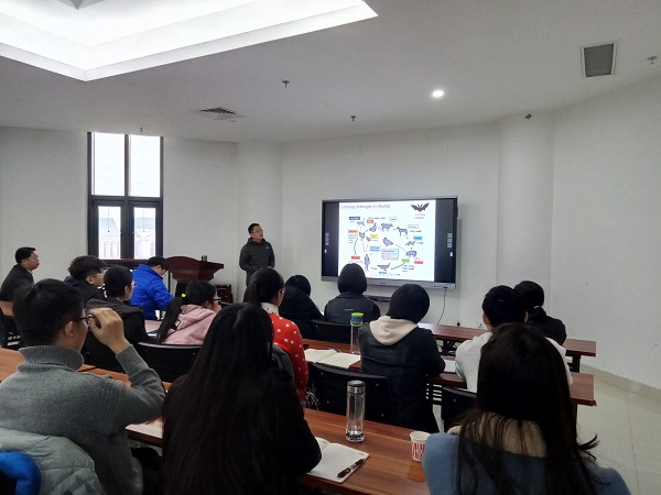 平继辉主要从事流感病毒的致病机理、跨宿主感染分子机制及流感疫苗的研发工作。他首先介绍了流感病毒的发现过程、全球流感大爆发情况和当前流感的防控策略;分析了当前流感疫苗毒株存在的不足,并以此为切入点,通过筛选寻找到合适疫苗株,为下一步生产高效流感疫苗奠定了坚实基础。此外,平继辉又阐释了流感病毒抗原变异机理和抗原变异预测的成果,该成果可以为预测流感流行毒株提供参考。报告结束后,他还与现场师生进行了互动交流。