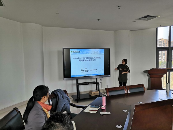 崔亚垒以《microRNA在对虾免疫及乳腺癌发展进程中的调控作用》为题,阐明了miRNA(WSSV-miR-N24)、miRNA(WSSV-miR-N12)、分别影响基因Caspase8、基因wsv399在宿主体内的表达,从而影响WSSV (白斑综合症病毒)在宿主细胞的存活和复制、潜伏力及miR-34能调控不同的靶基因参与癌细胞增殖与迁移的通路,从而抑制乳腺癌的发展进程。