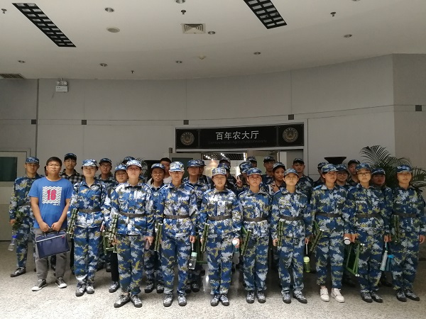 新生在百年农大厅前合影留念