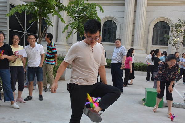 趣味健身活动包括羽毛球定点发球、趣味乒乓球、连锁踢毽子和推铁环等,其中羽毛球定点发球和趣味乒乓球为单人项目,连锁踢毽子和推铁环为4人合作项目,教职工们根据自身特长以及爱好积极参与。炎热的天气也阻挡不了大家高涨的运动热情,活动现场气氛轻松愉快,欢笑声与欢呼声交织不断,