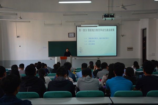辅导员杜海利介绍了毕业生系列活动日程安排,讲解了就业政策、毕业程序、组织关系转递等工作,重点强调了毕业前的安全稳定。